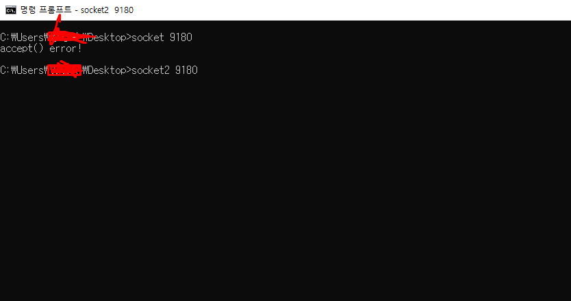 나는 socket과 socket2 라는 이름의 exe file이 있는데, socket은 listen()을 빼먹었을 당시의 파일이고,