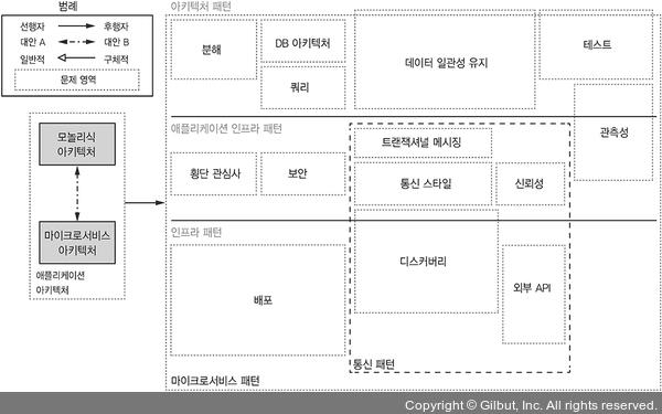 위 그림은 마이크로서비스 패턴 언어로, 좌측은 모놀리식과 아키텍처가 서로의 대안임을 의미하고.
