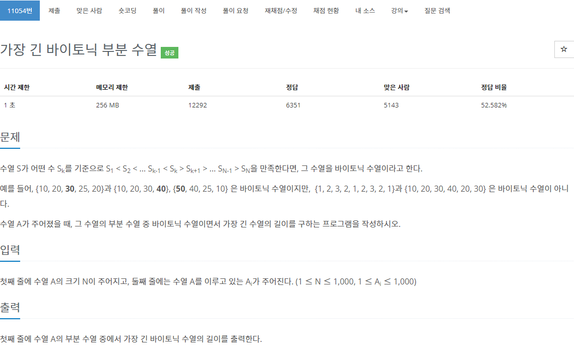 [DP] 가장 긴 바이토닉 부분 수열 (백준 11054번) 본문
