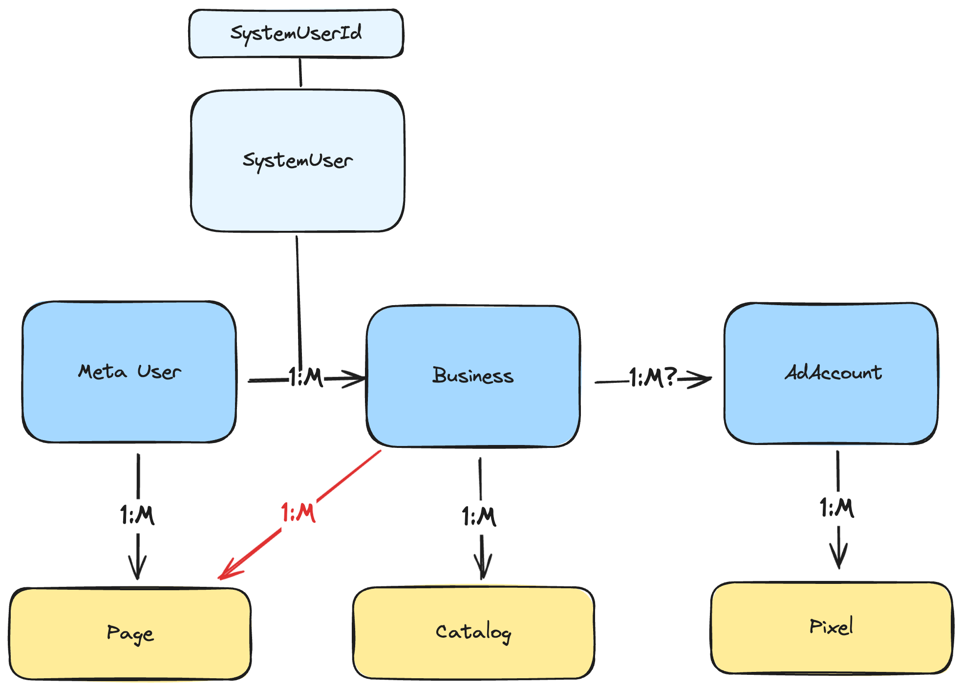 메타 서비스의 '유저'는 여러 개의 '비즈니스'를 가지고, '비즈니스'는 다시 여러 개의 '광고 계정'을 가진다.
