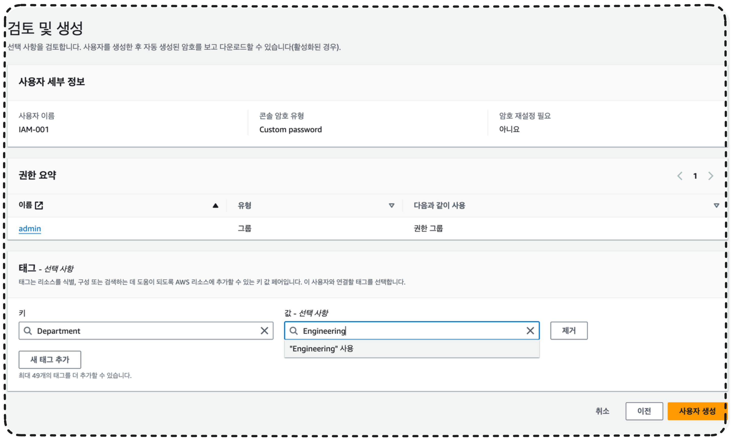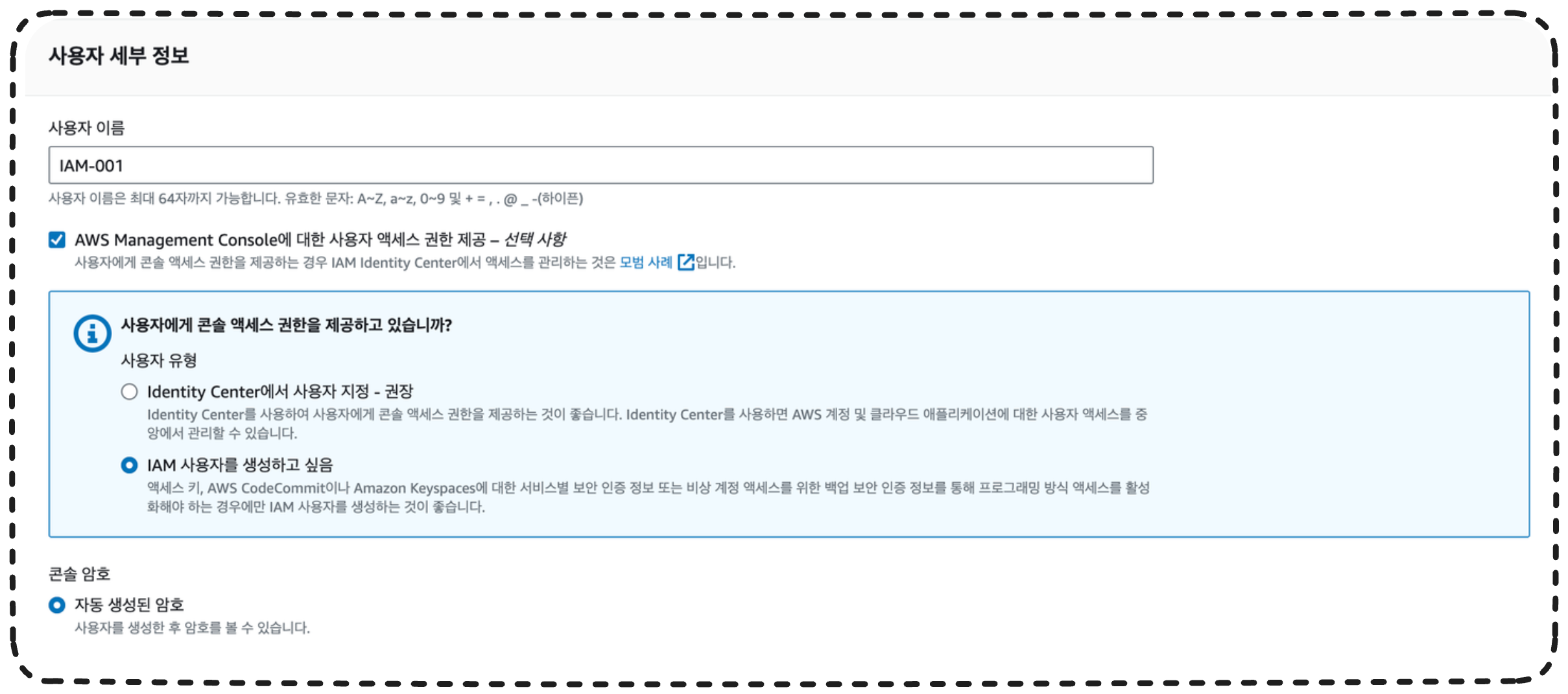 나의 경우에는 'IAM-001' 이라고 입력했는데, 이는 이 사용자의 이름이 될 것이다. ( 추후 로그인할 때 사용자의 이름을 사용한다. )
