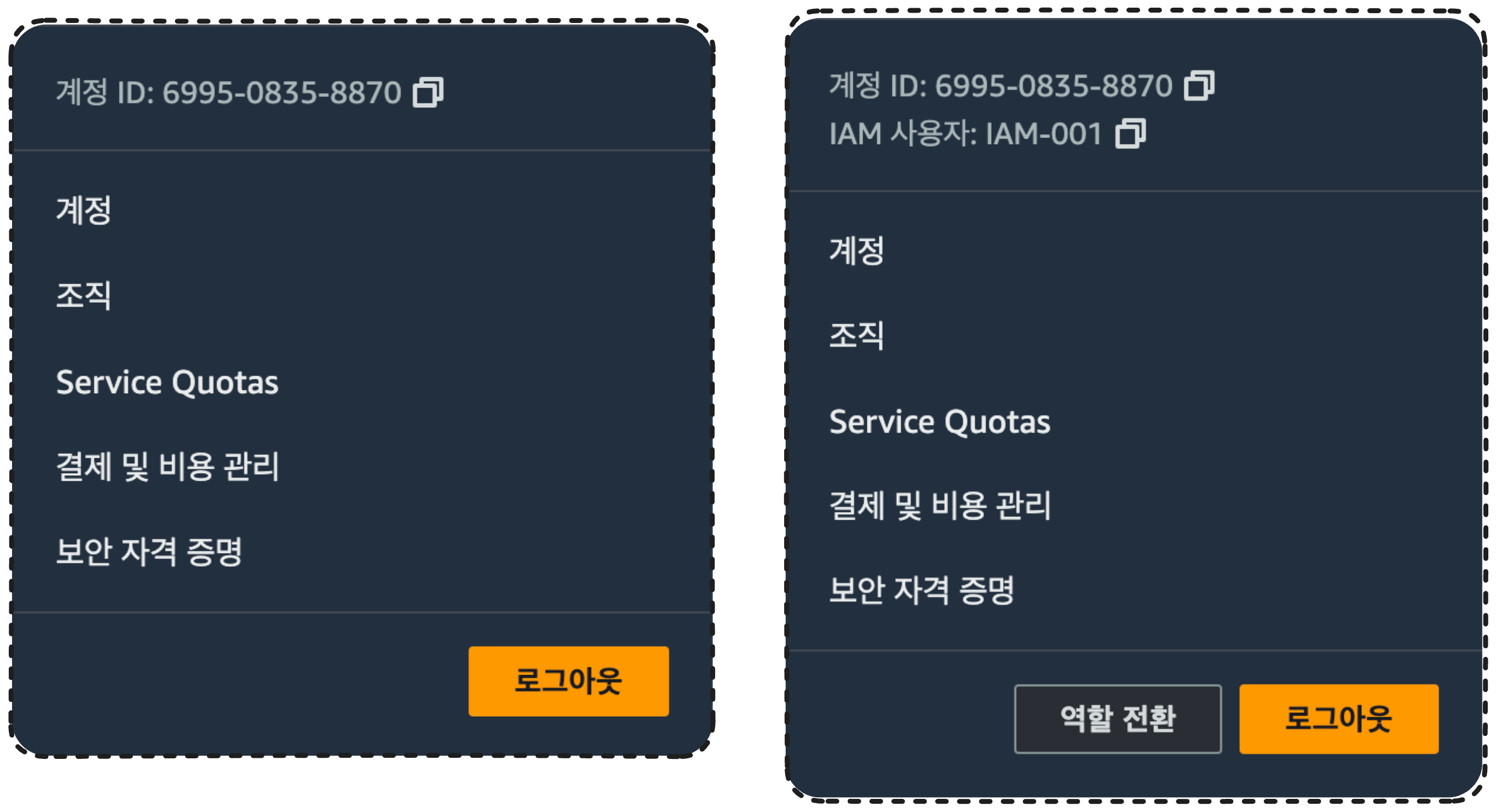 각각 로그인 후 상단의 프로필 탭을 누르면 루트 계정과 IAM 사용자가 나뉘는 것을 볼 수 있다.