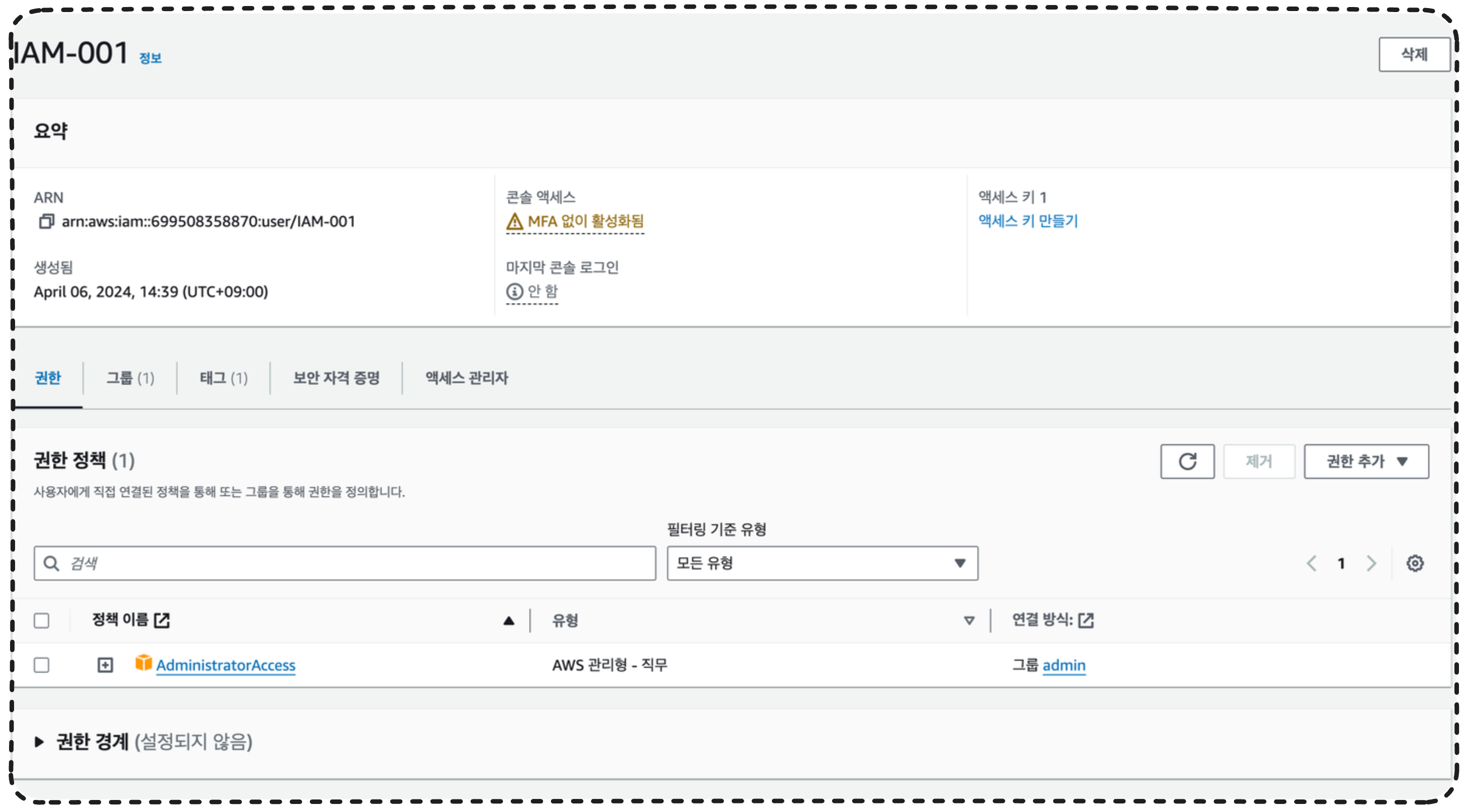사용자 탭으로 가서 방금 만든 IAM-001을 누르면 위와 같이 방금 만든 사용자의 상세를 볼 수 있다.