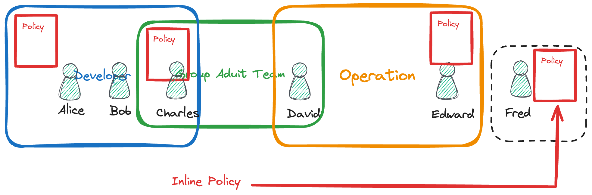 여담으로, Fred와 같이 어떤 그룹에도 속하지 않은 유저에게는 그 유저만 해당하는 권한을 부여할 수 있는데 이를 인라인 정책이라고 한다.