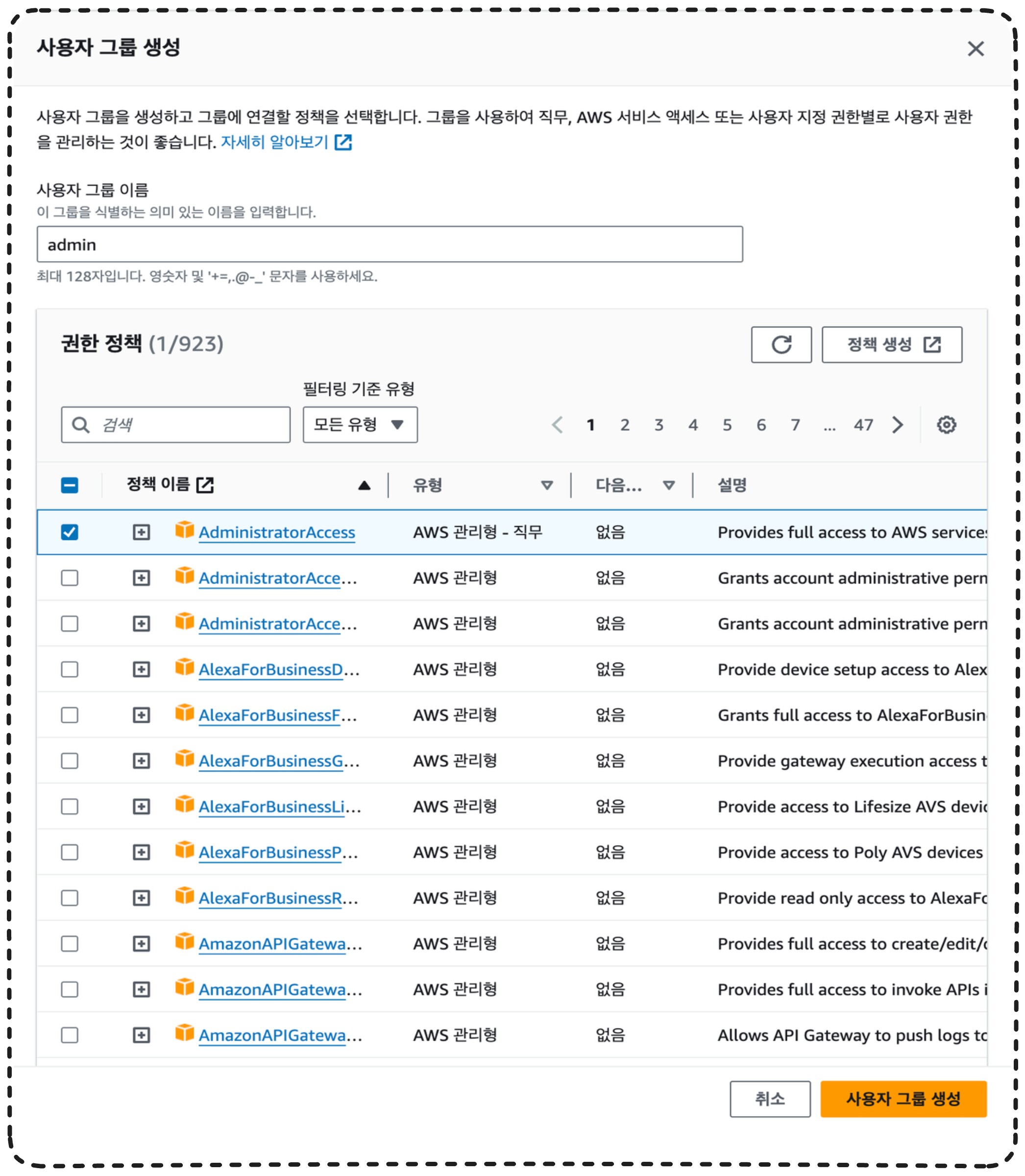 여기서는 admin으로 이름을 설정하고 모든 권한을 주기 위해 'AdministratorAccess'를 선택한다.