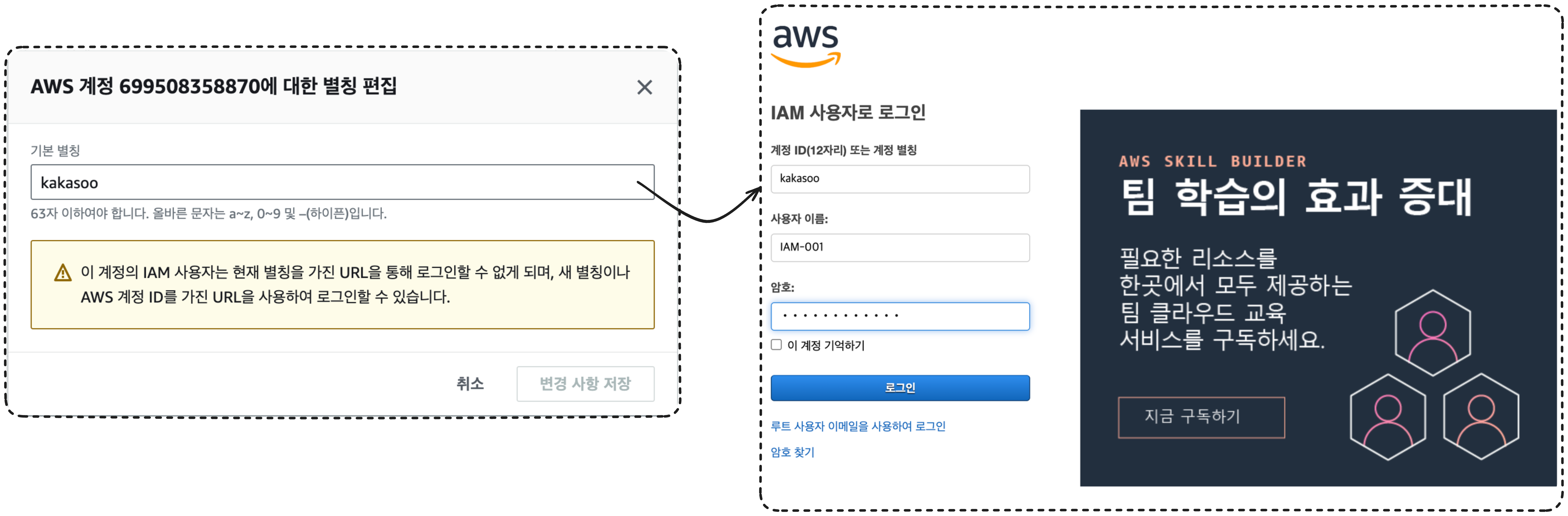 별칭을 'kakasoo' 라고 설정한 경우 ID 12자리 대신 'kakasoo' 라는 별칭을 사용하고, 사용자 이름으로 계정 사용자로 로그인이 가능하다.