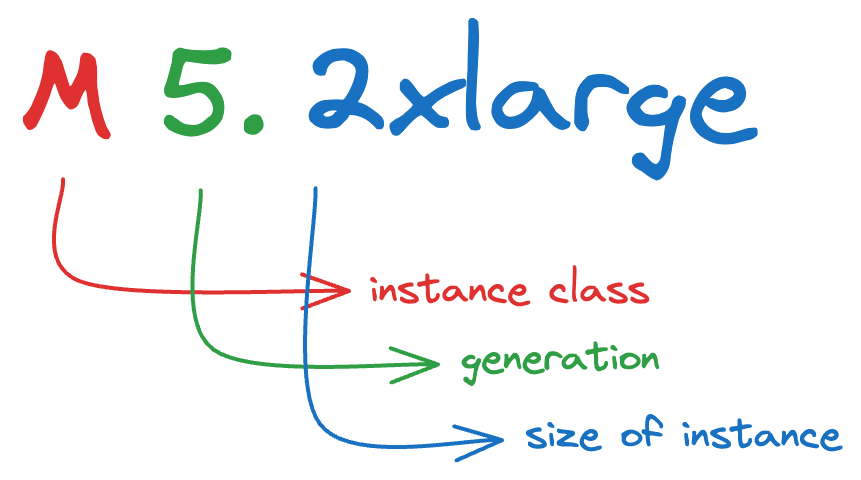 이름의 명명 규칙은 인스턴스 클래스와 세대, 그리고 인스턴스의 크기 순으로 작성되며, 세대는 높을수록 나중에 만들어진 최신 버전이다.